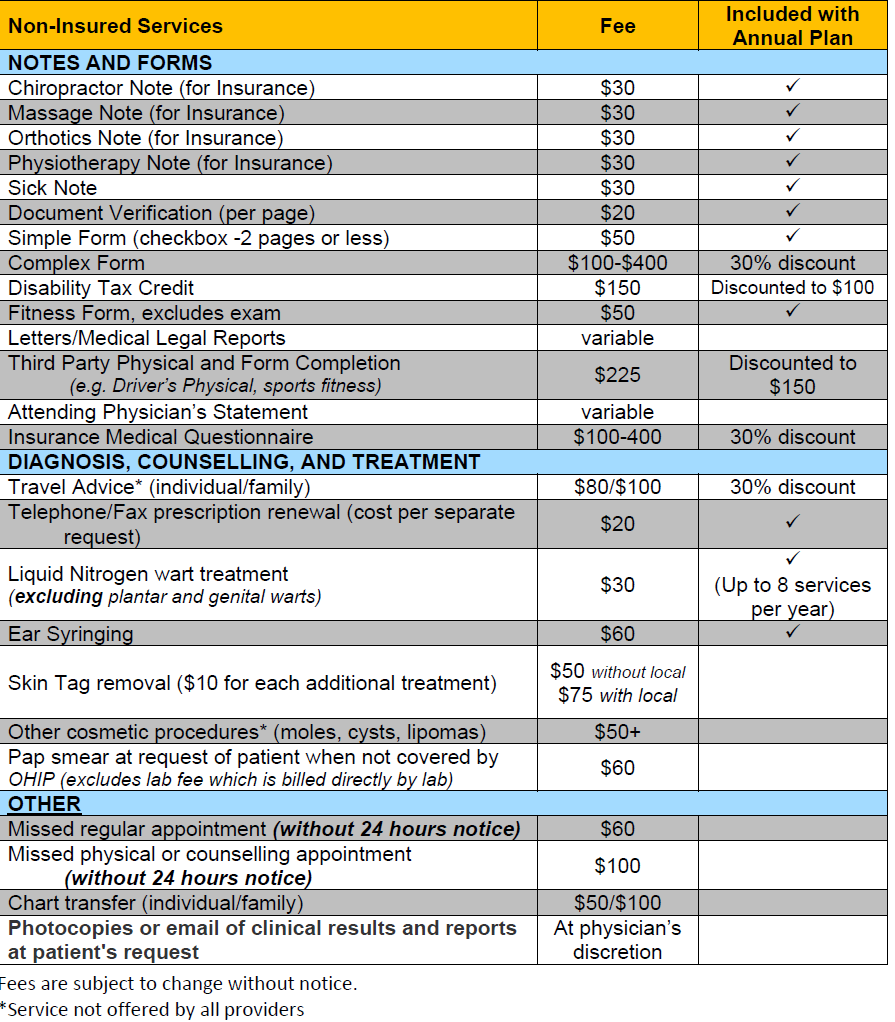 Your healthcare providers at the West Durham Family Health Team are committed to providing you with the best medical care possible. We are always looking at ways to make your visit helpful, informative and an overall positive experience. We ask you to recognize that while OHIP covers the cost of most of your medical needs, there are many time-consuming services which are not covered. These are called Uninsured Services, and they include: